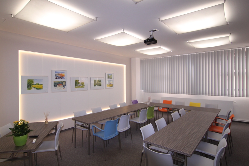 Durch die Schaffung einer positiven und offenen Atmosphäre wird die Aufnahmefähigkeit und kreative Teilnahme der Seminarteilnehmer angeregt. Die Installation einer Galeriewand ermöglicht die Präsentation ortsansässiger Künstler und zeigt damit die lokale Verbundeheit des Unternehmens.
