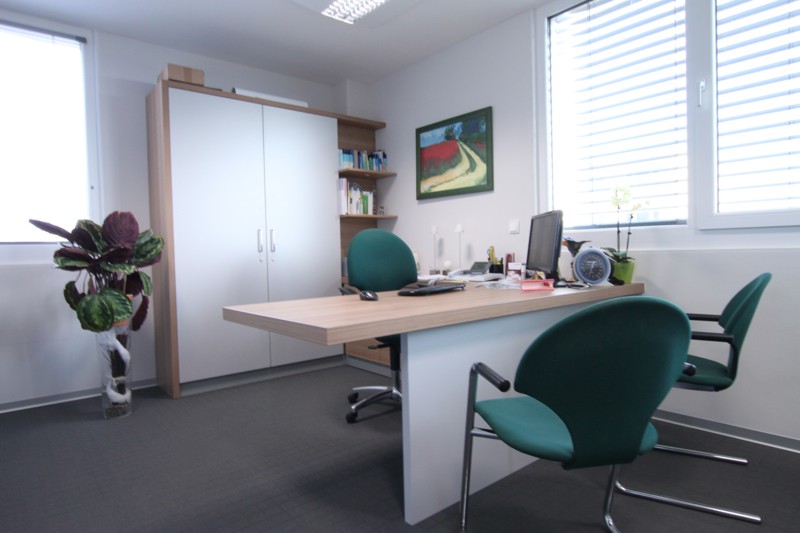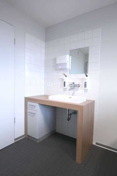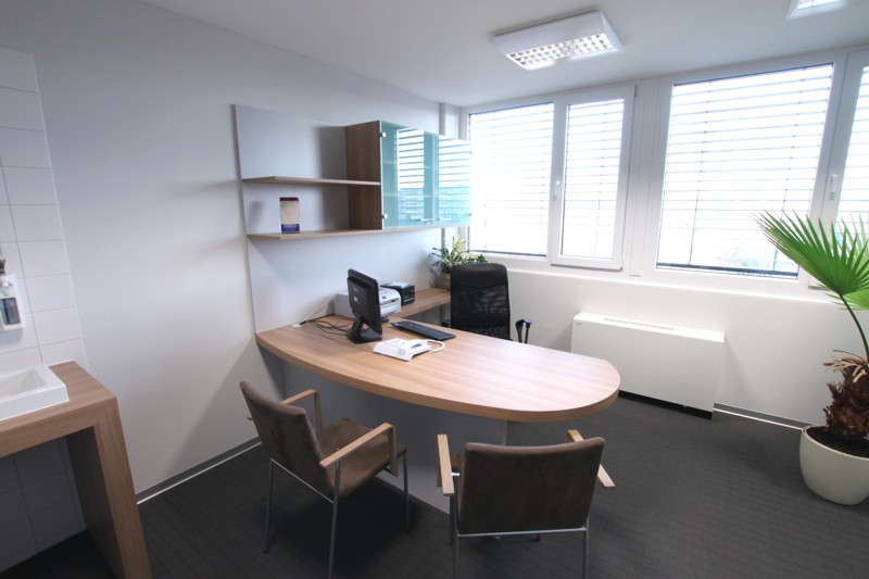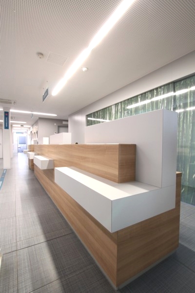 Die durchgängige Innenraumgestaltung des Gebäudes von den Praxiseinrichtungen des MVZ bis hin zur Einrichtung der Apotheke vermittelt auch architektonisch die komplexe Patientenbetreung der einzelnen medizinischen Leistungsanbieter.